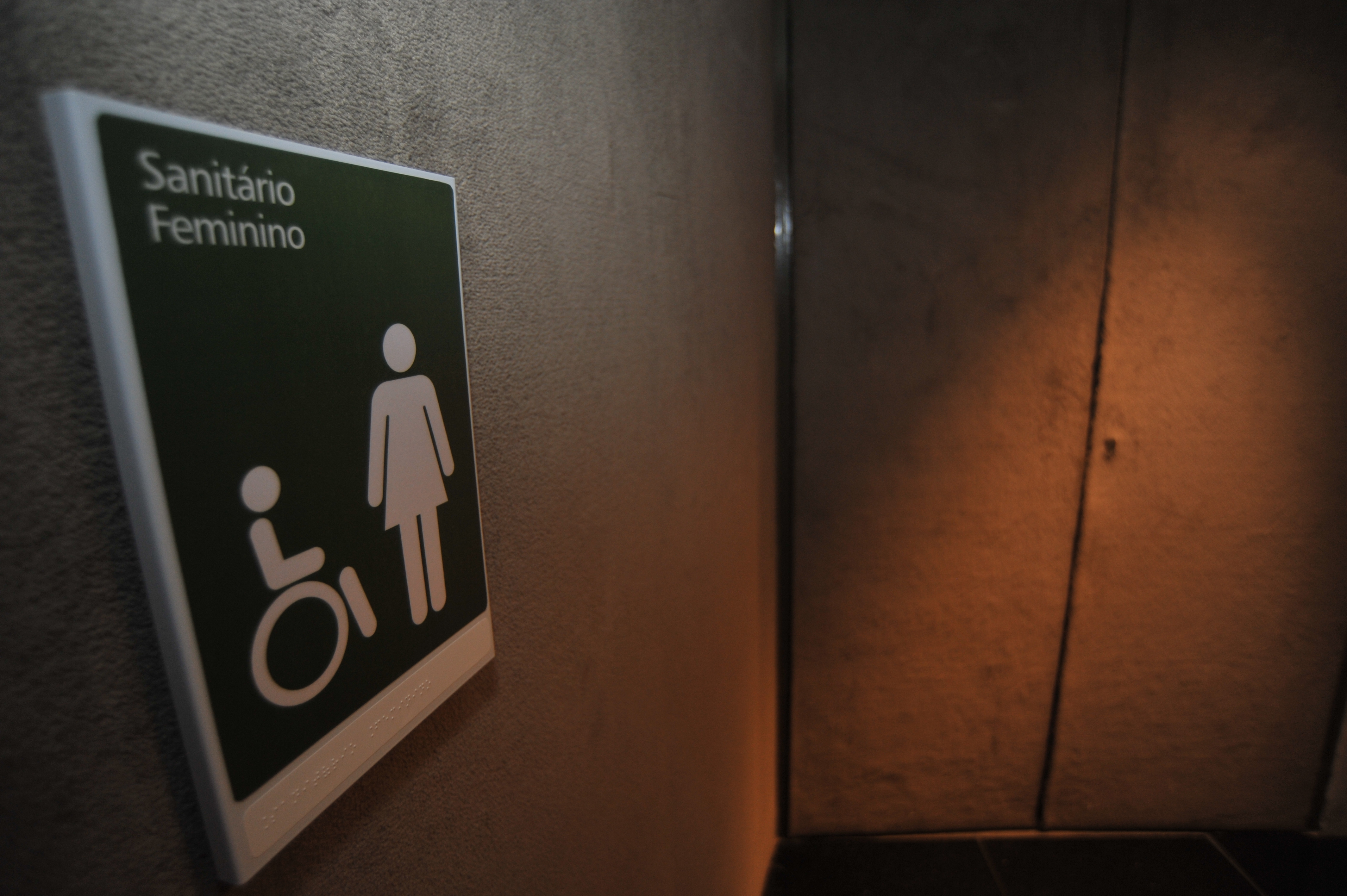 Placa de sinalização dos sanitários visual e em braile.