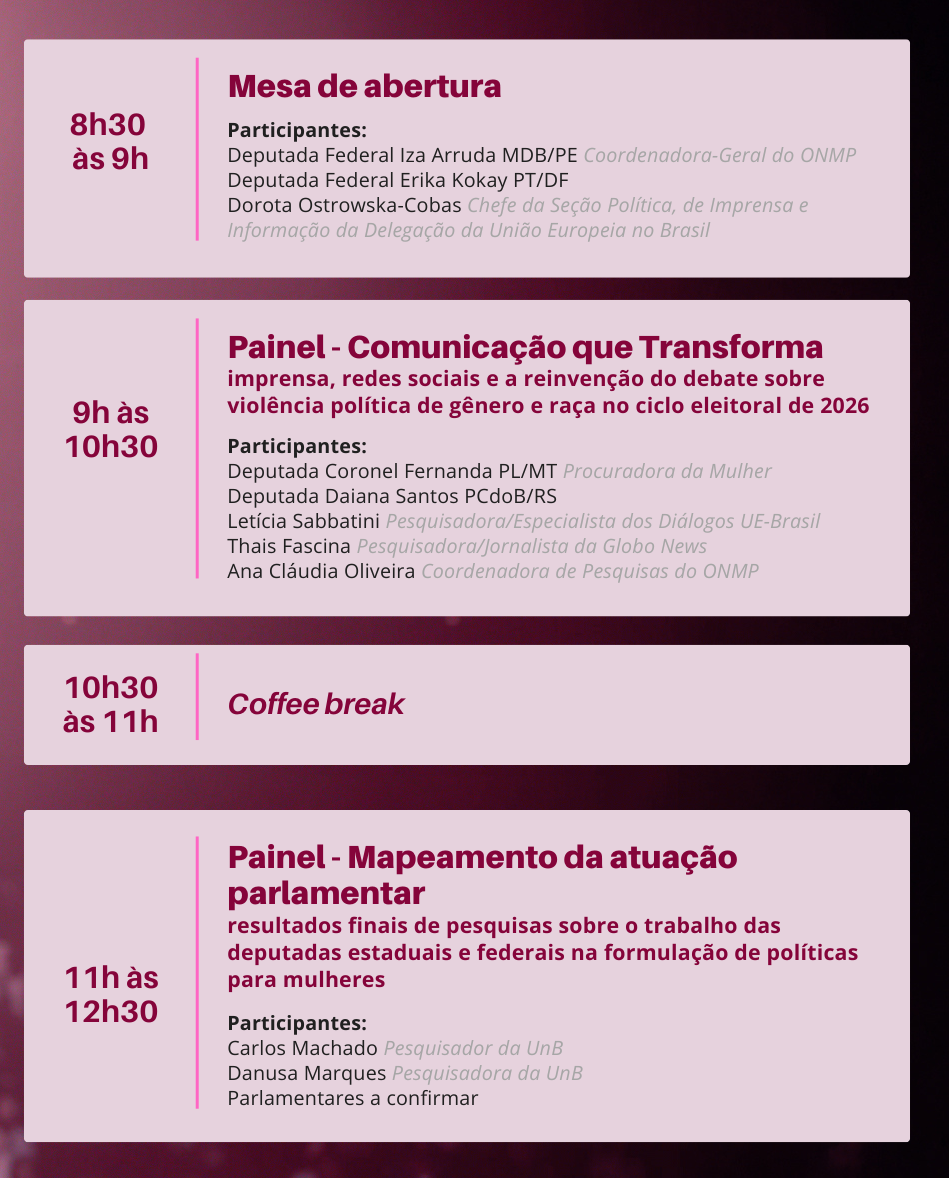 Esta edição reunirá a apresentação de resultados inéditos de dois projetos conduzidos pelo ONMP em colaboração com instituições parceiras. Na primeira parte do evento, haverá a apresentação de resultados preliminares do projeto Fortalecendo a Participação Política das Mulheres e Combatendo a Violência de Gênero na Era Digital, implementado no âmbito dos Diálogos Setoriais União Europeia-Brasil. Já a segunda parte do evento, trará pesquisadores do Instituto de Ciência Política da Universidade de Brasília para apresentação dos resultados finais do projeto Mapeamento da Atuação Parlamentar das Deputadas Estaduais Brasileiras.