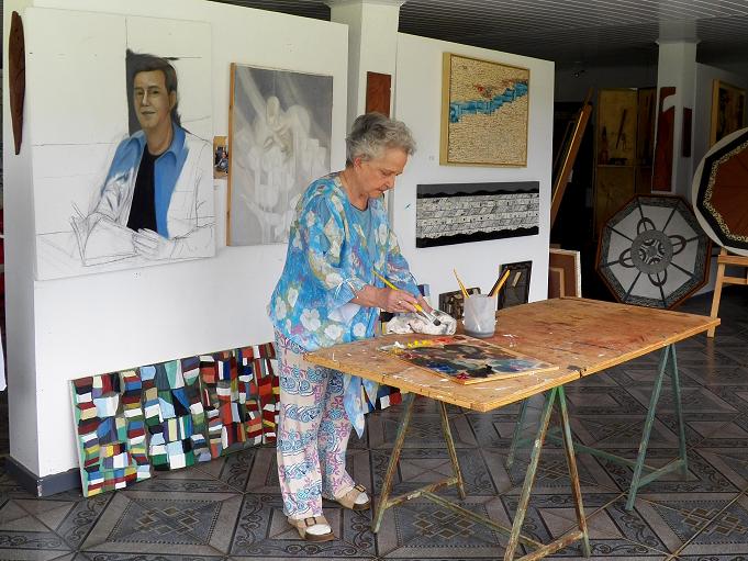 Foto da artista em seu ateliê