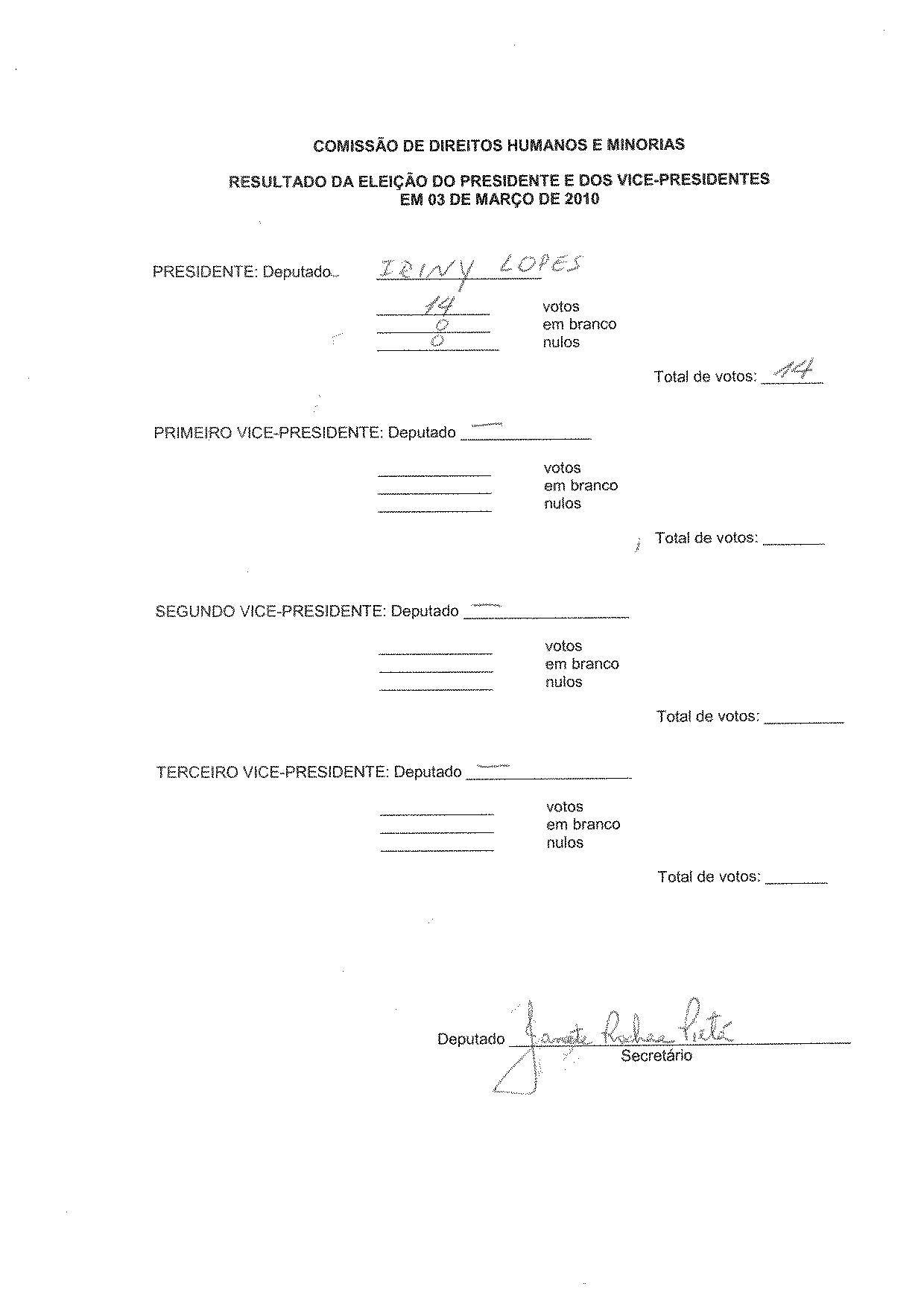 Resultado da Eleição do Presidente da CDHM - 2010