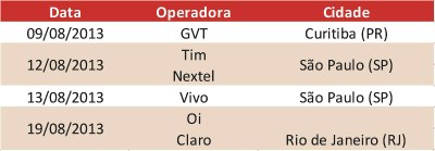 O plano de trabalho do GT da telefonia também prevê uma série de visitas aos centros de gerenciamento e call centers das operadoras, localizados em Curitiba, São Paulo e Rio de Janeiro. Segundo o presidente do GT, deputado Edinho Bez (PMDB-SC), serão visitadas as instalações da GVT, TIM, Nextel, Vivo, OI e Claro. “Será uma visita técnica para que possamos compreender o sistema como um todo. Isso nos ajudará na hora de definirmos a nossa proposta”, esclareceu Bez. As visitas estão agendadas para os dias 9, 12, 13 e 19 de agosto.